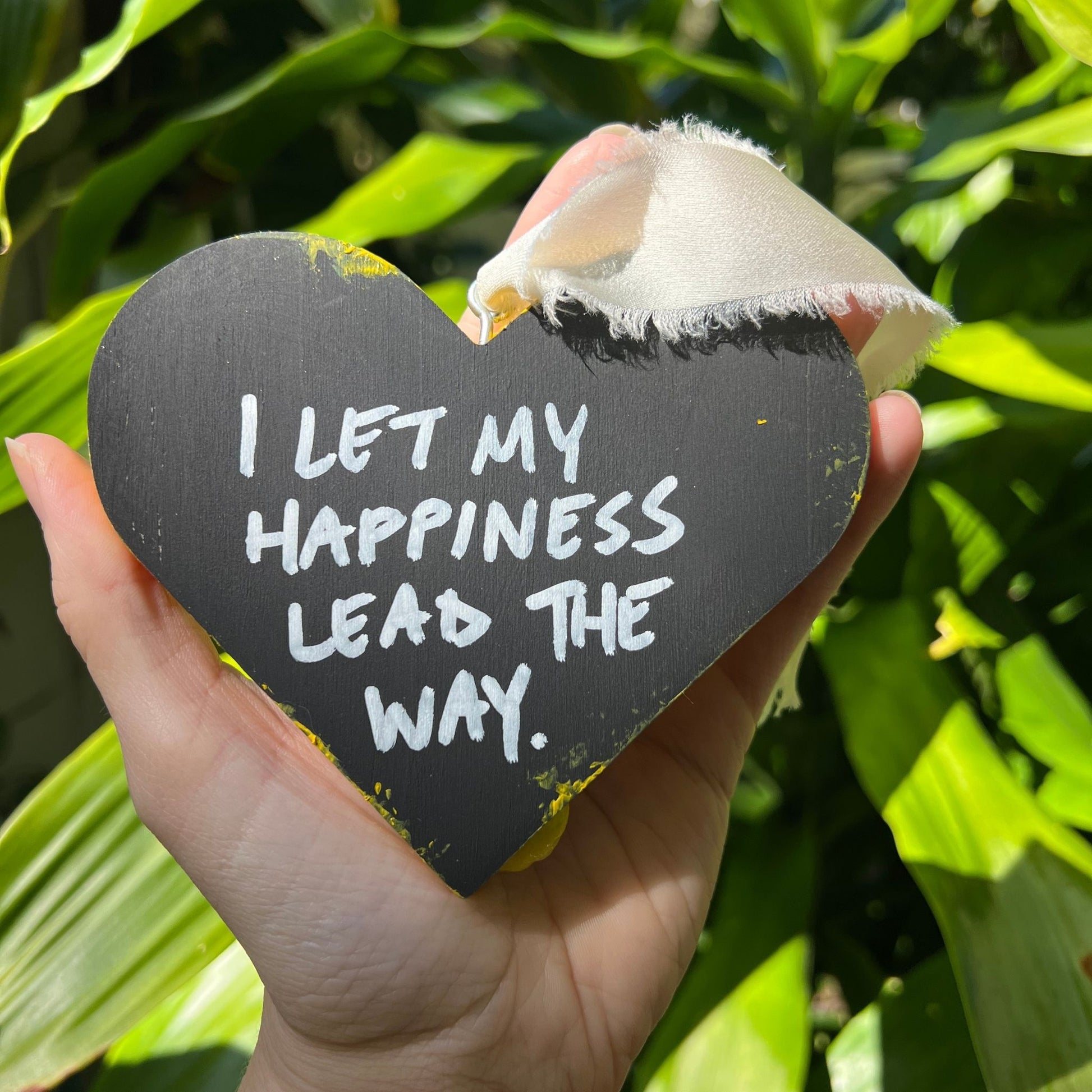 Invite in love energy of the heart shape to your space with a positive affirmation on the back of the heart ornament