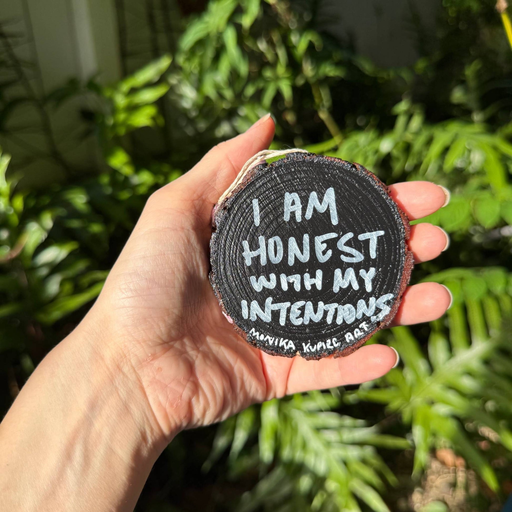 Fill your space with channeled colors + positive messages by displaying this energy infused affirmation wood circle decor on your tree, work desk, nightstand or kitchen.